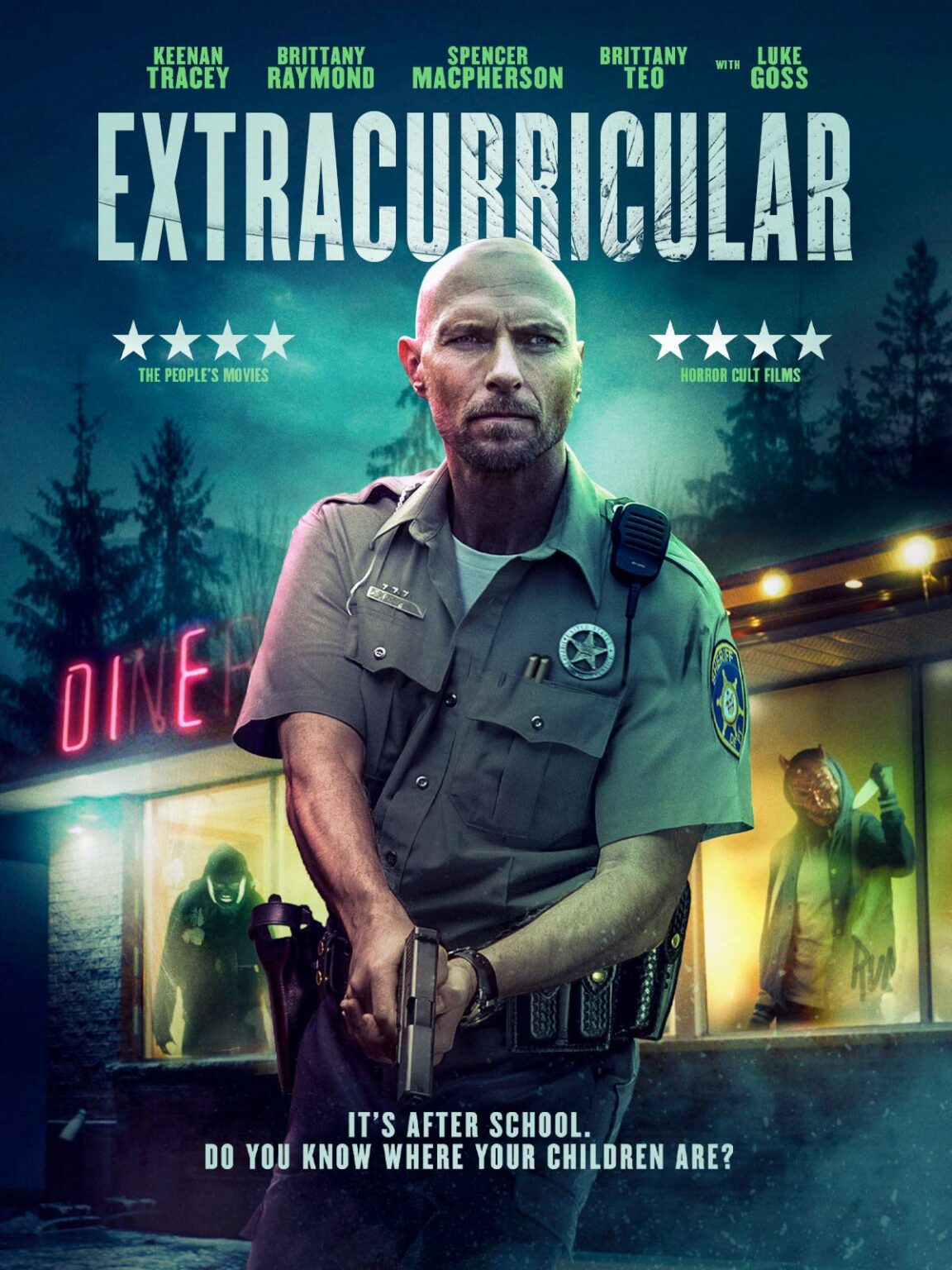 After a busy night’s killing, the four disaffected teenagers gather at their local diner to gloat about what went well and make snarky comments on news coverage of their work. They argue routinely about the need to avoid predictable tactics (“Halloween seems so cliched- it’s not, it’s classic!”). There are fleeting nods to past mask-wearing maniacs (“Maybe potato sacks with eyes cut out?”) but Xue avoids overt post-SCREAM style genre referencing. Detailed preparations for home invasions are juxtaposed with scenes of small-town sheriff Luke Goss investigating the crimes…and he happens to be the dad of two of the perpetrators.