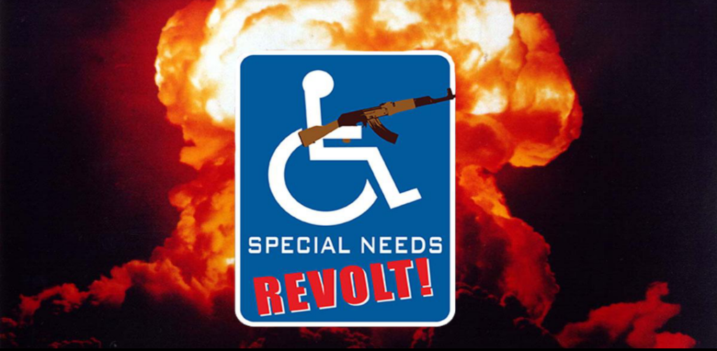 Special Needs Revolt! takes place in the fictional town of Donville, NY. After Billy Bates wakes from a coma, he discovers that the USA is now a brutal dictatorship and all people with disabilities have been put into institutions. Evil President Kruger has divided the country into people who support him…and those who don’t. People who oppose Kruger face imprisonment or death.