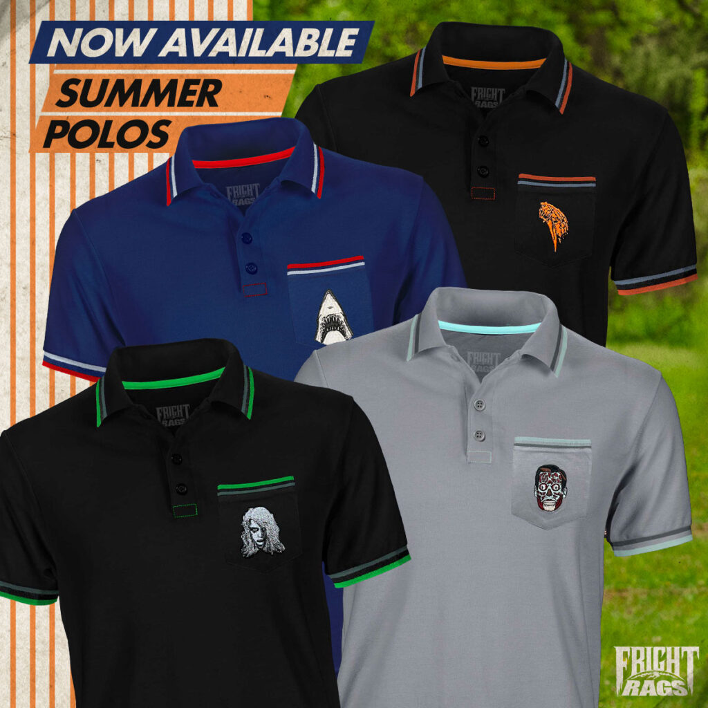 With everything from shirts, lounge pants, and hats to jackets, socks, and enamel pins, Fright-Rags has always been an innovator of horror apparel. Today the company introduces a new style to its diverse selection: polo shirts.