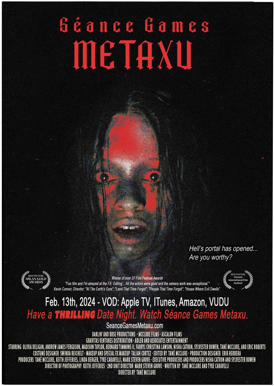 Directed by Tane McClure, ‘Séance Games Metaxu‘ was written by Tane McClure and Tyke Caravelli and stars Eric Roberts, Tane McClure, Nisha Catron, Andrew James Ferguson, Olivia Deligan, Madison Taylor, Bernard Timmons II, Farryl Christina Lawson, Sylvester Bowen.